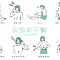 女性の健康・更年期生理痛(月経困難症)、腹痛、腰痛、冷え、子宮内膜症など、女性特有の痛みや、内科的な不調(胃腸炎、便秘など)を表現したイラストです。痛み止め(鎮痛剤)の説明、婦人科、内科、セルフケアなどの解説資料に幅広くご使用ください。