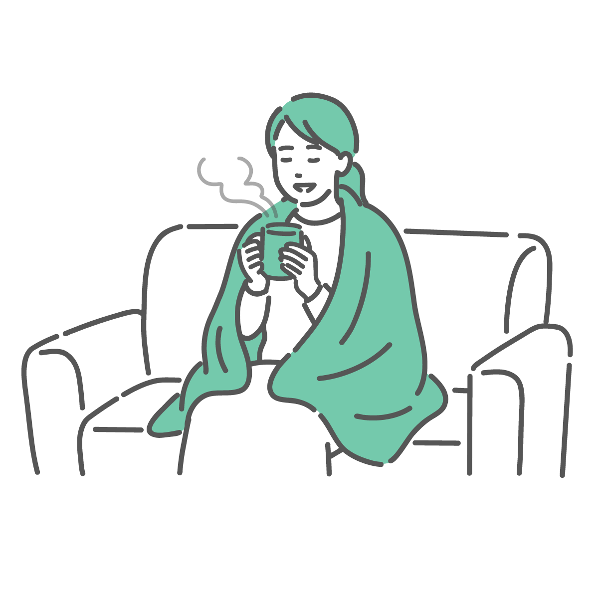 セルフケア・マッサージ ソファで温かい飲み物を飲む女性のイラスト(温活・リラックス)