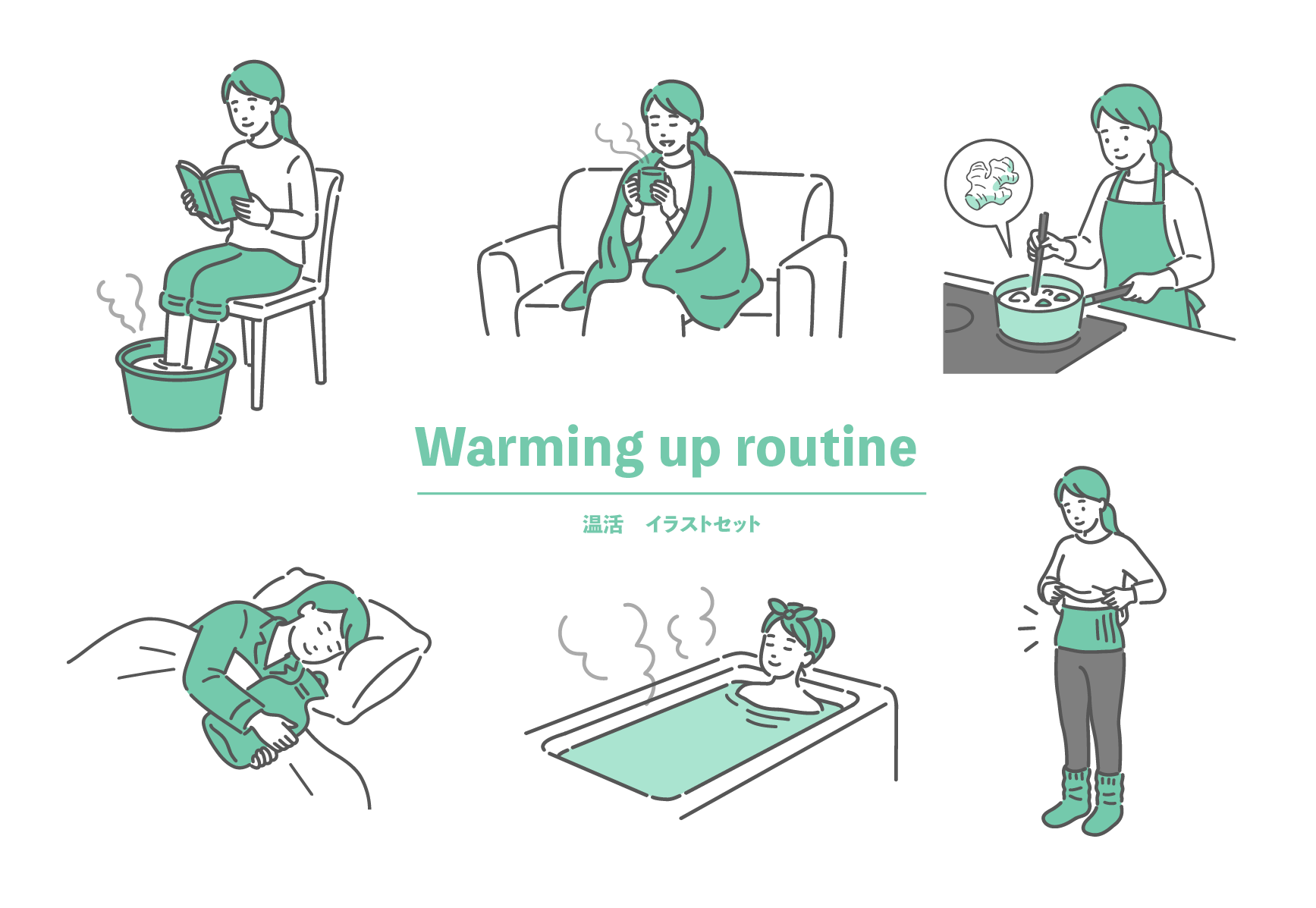 セルフケア・マッサージ 女性の温活ルーティンセットのイラスト(冷え性改善・セルフケア)